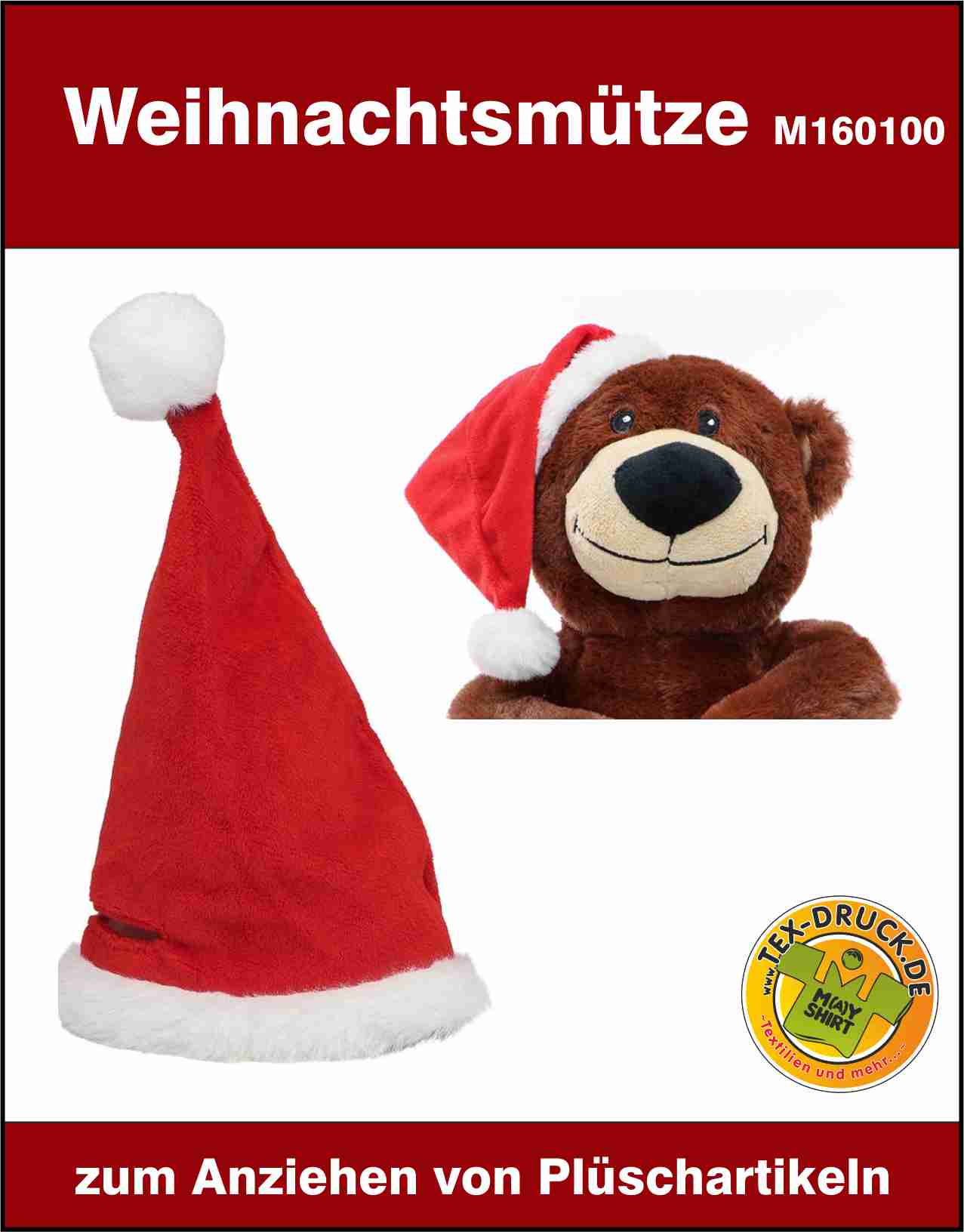 Weihnachtsmütze für Plüschtiere Gr. M, mit einem Schlitz für ein Ohr an der Seite